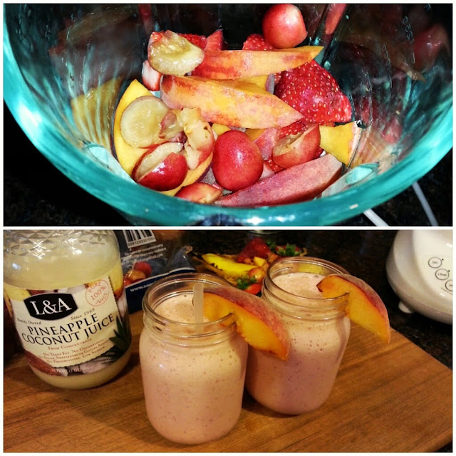 First, get out the blender and plug her in. Then use your knife and cut up all your fruit (banana, cherries, strawberries and peaches) and toss them in the blender. Then add the juice, milk and sugar or honey. I use sugar because I don't drink a lot of sugary drinks and I'm cool with a little sugar here and there. As usual moderation and balance in everything is important. Blend all of this together on the puree setting if you have one. If not, the lower setting. Just to get it all pureed. After that you can add the ice and blend for a couple of minutes or until the ice is completely blended. Add the vanilla protein powder and blend, if you choose. It just adds a little something extra and turns the smoothie into more of a meal replacement smoothie. This smoothie is great before or after a workout. Once everything is blended, use your spoon to taste the smoothie and make sure that it is up to your standards and preferences. If it is too thick then just add a little more juice or water to thin it out. If it is too runny then just add a little more ice, a cube at a time. It should be pretty close to perfect. Pour into your cups and enjoy!